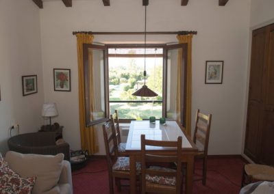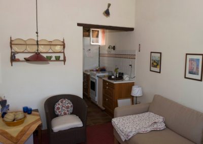 Soveværelset vender mod nord med udsigt over Luberon bjergene. Møbleret med dobbeltseng, indbygget skab m.m. Stue og soveværelse er forbundet med et køkken indeholdende service til 4 personer, køleskab, miniovn og gaskomfur.